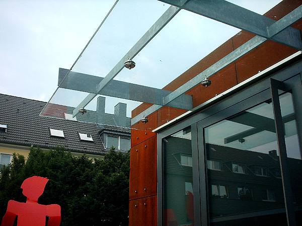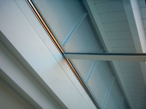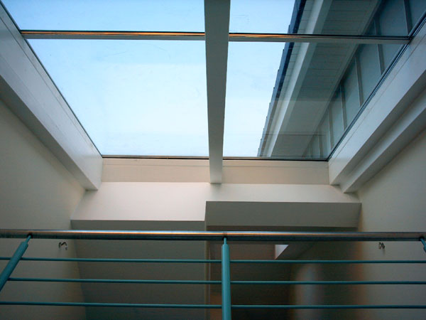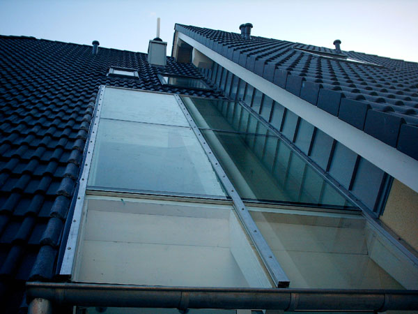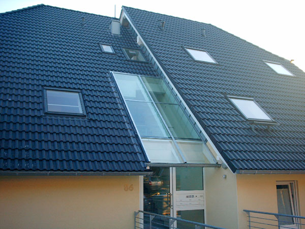 Eine Dachverglasung im Treppenhaus- und Eingangsbereich. Die Scheiben wurden aufgrund ihrer Länge mittig geteilt.